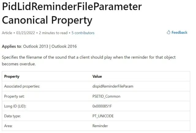 根据 Microsoft,属性“ PidLidReminderFileParameter”用于指定当特定对象的提醒过期时应由 Outlook 客户端播放的音频文件名。由于此属性可以接受文件名,因此文件名可能是导致触发 NTLM 身份验证的 UNC 路径。