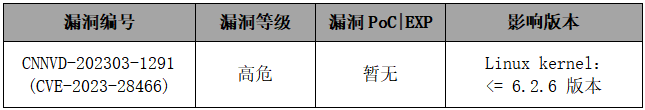 近日,嘉诚安全监测到CNNVD官方发布了Linux kernel 释放后使用漏洞的安全风险通告,漏洞编号为:CNNVD-202303-1291(CVE-2023-28466)。