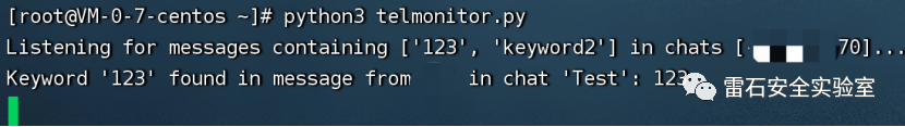 from telethon import TelegramClient, eventsfrom telethon.errors.rpcerrorlist import AuthKeyErrorfrom telethon.sync import TelegramClient as SyncTelegramClientapi_id = xxxxapi_hash = 'xxxxxx'session_name = 'my_session'chat_names = ['Test', 'groupid']keywords = ['123', 'keyword2']try:client = TelegramClient(session_name, api_id, api_hash)client.start()except AuthKeyError:client = SyncTelegramClient(session_name, api_id, api_hash)client.start()@client.on(events.NewMessage(chats=chat_names))async def handle_new_message(event):message_text = event.message.messagefor keyword in keywords:if keyword in message_text:chat = await event.get_chat()title = chat.titlesender = await event.get_sender()sender_name = sender.first_nameprint(f"Keyword '{keyword}' found in message from {sender_name} in chat '{title}': {message_text}")print(f"Listening for messages containing {keywords} in chats {chat_names}...")client.run_until_disconnected()