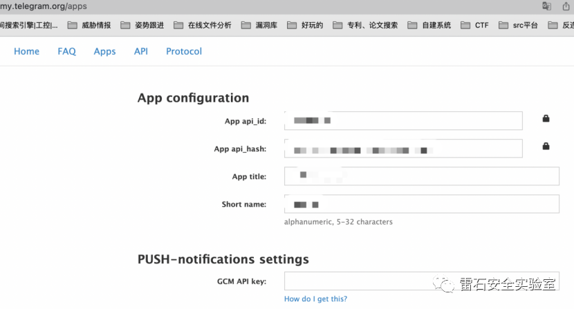 访问my.telegram.org,登陆后创建app,获取app api_id和app api_hash