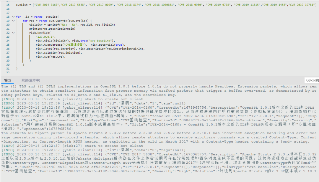 如下图,我们根据 chatgpt 返回的它认为比较知名的 CVEID,进行漏洞信息的查询,为了方便查看,这里使用risk.NewRisk保存这些 CVEID 的漏洞信息。
