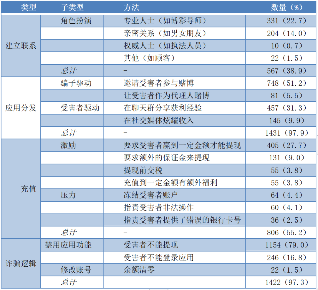 为了调查社会工程学攻击在移动博彩诈骗中的使用,我们对诈骗案件报告进行了定性研究。每一份报告都与一名独立的受害者有关。受害者的年龄范围是14-79岁(小于20岁占2.1%,21-40岁占70.6%,41-56岁占22.9%,大于57岁占4.4%),学历在小学至博士之间(小学2.8%,初中21.5%,高中23.3%,大学52.4%)。本文试图回答以下研究问题: