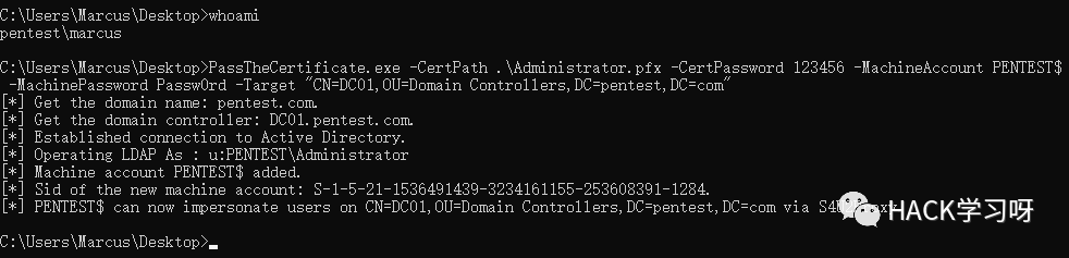 通过 Shadow Credentials 或其他证书窃取的方法(THEFT1、THEFT3 或 THEFT4)获得域控制器或域管理员等高权限帐户的证书(.pfx),然后执行以下命令,通过证书认证到 LDAPS,添加一个名为 “PENTEST” ,密码为 “Passw0rd” 的机器账户,并设置 PENTEST 到域控制器 DC01 的 RBCD。