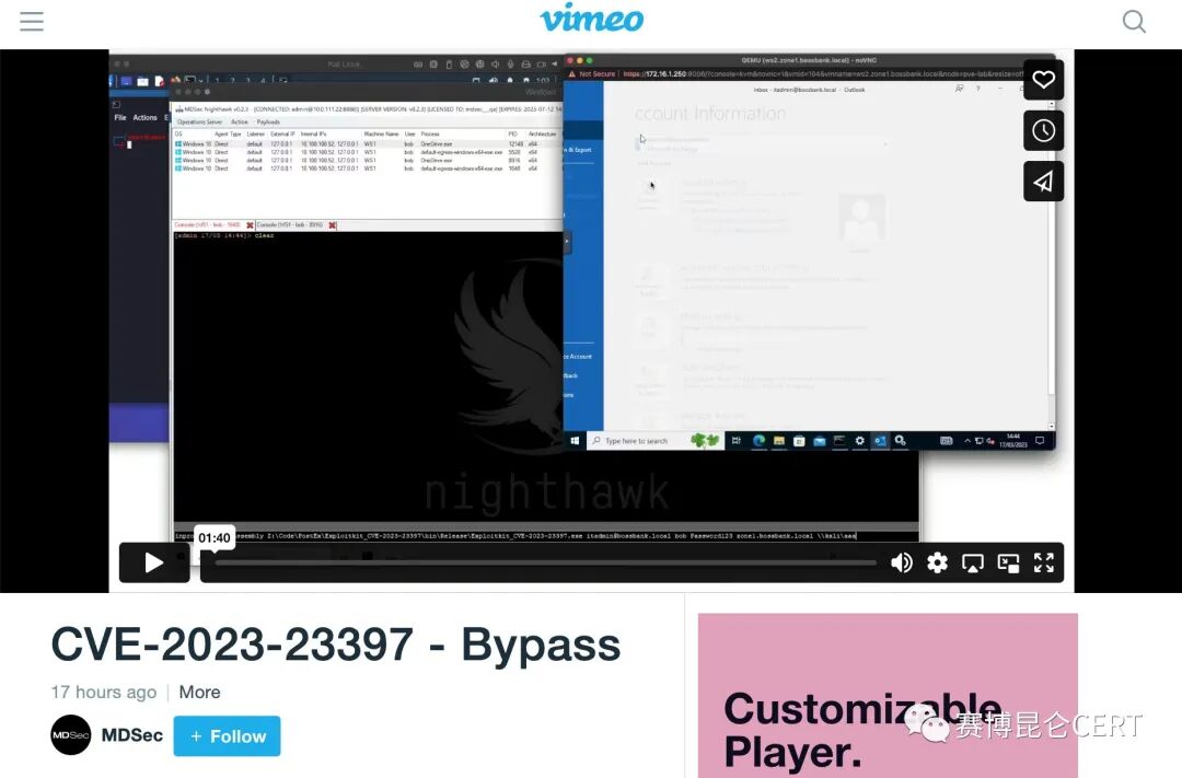 在2023年3月15日,赛博昆仑CERT监控到微软三月补丁日更新,经过研判,Microsoft Outlook特权提升漏洞(CVE-2023-23397)可能造成严重危害,并发布《【复现】【已支持热补】Microsoft Outlook特权提升漏洞(CVE-2023-23397)风险通告和洞见平台热补丁更新》,告知客户尽快修复。