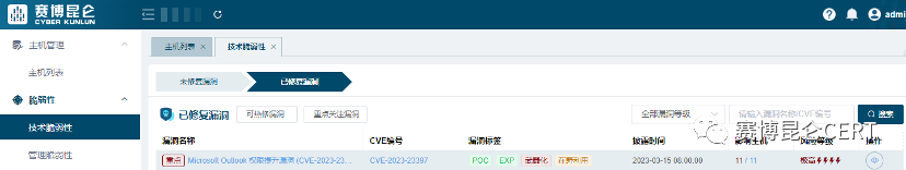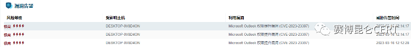 2023年3月15日,赛博昆仑-洞见产品支持CVE-2023-23397漏洞检测和热补丁防护