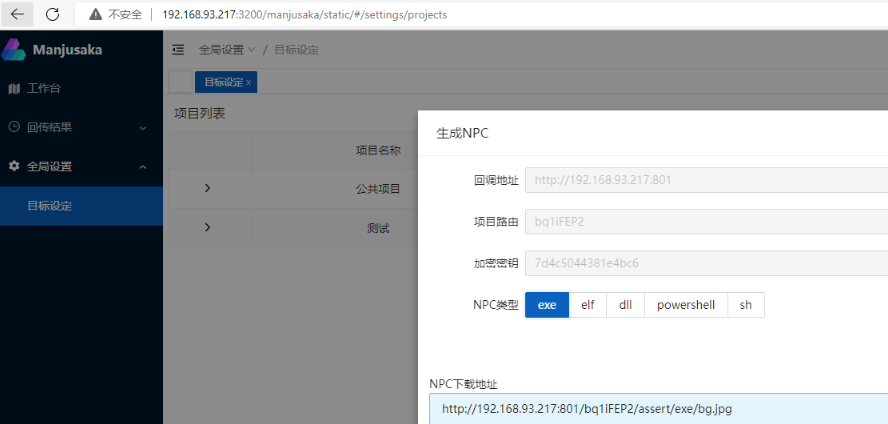 http://192.168.93.217:3200/manjusaka3、根据项目 生成npc 可以直接使用exe或elf格式的npc。也可以使用其它语言加载npc母体 比如使用python加载npc母体dll,或者使用shellcode内存加载的形式