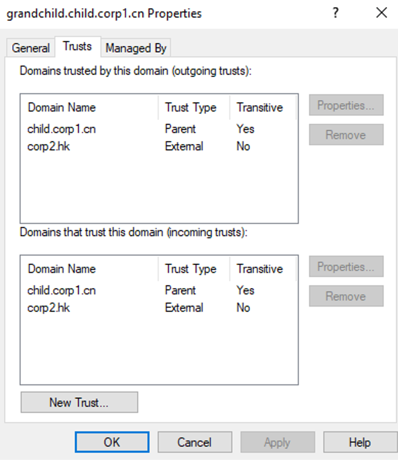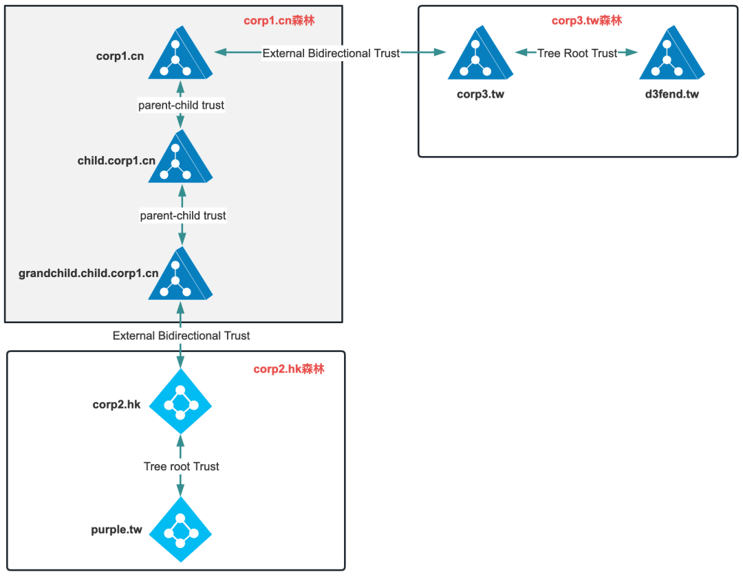域grandchild.child.corp1.cn和corp2.hk也存在双向的非传递性信任:
