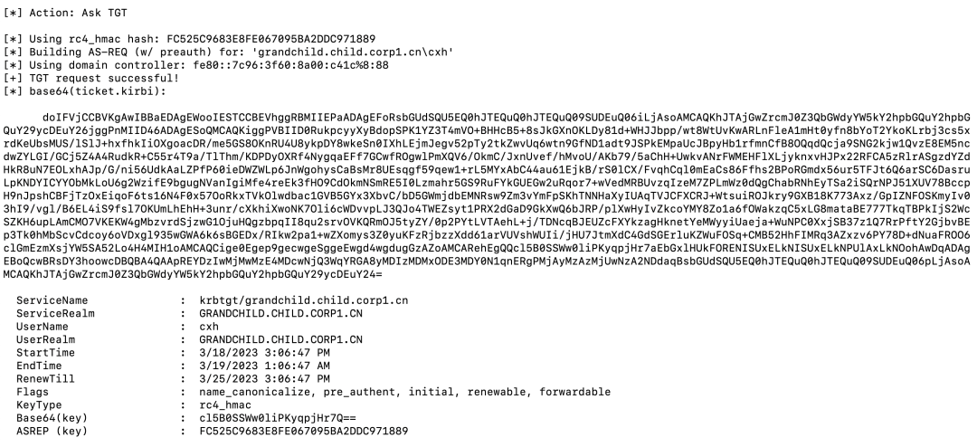 下面我们以grandchild.child.corp1.cn域内普通域用户权限进行操作,演示整个认证过程。首先使用Rubeus手动请求一个初始(initial)TGT: