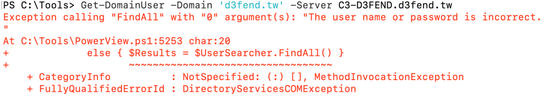 如上图,我们以用户[email protected]的身份,从域控C3-DC01.corp3.tw为d3fend.tw域请求了一个referral。有了这个referral后,我们可以请求一个访问d3fend.tw域内服务的票据。这里以LDAP服务为例。在没有服务票据之前,我们从corp2.hk域枚举d3fend.tw域的信息,会提示错误The user name or password is incorrect: