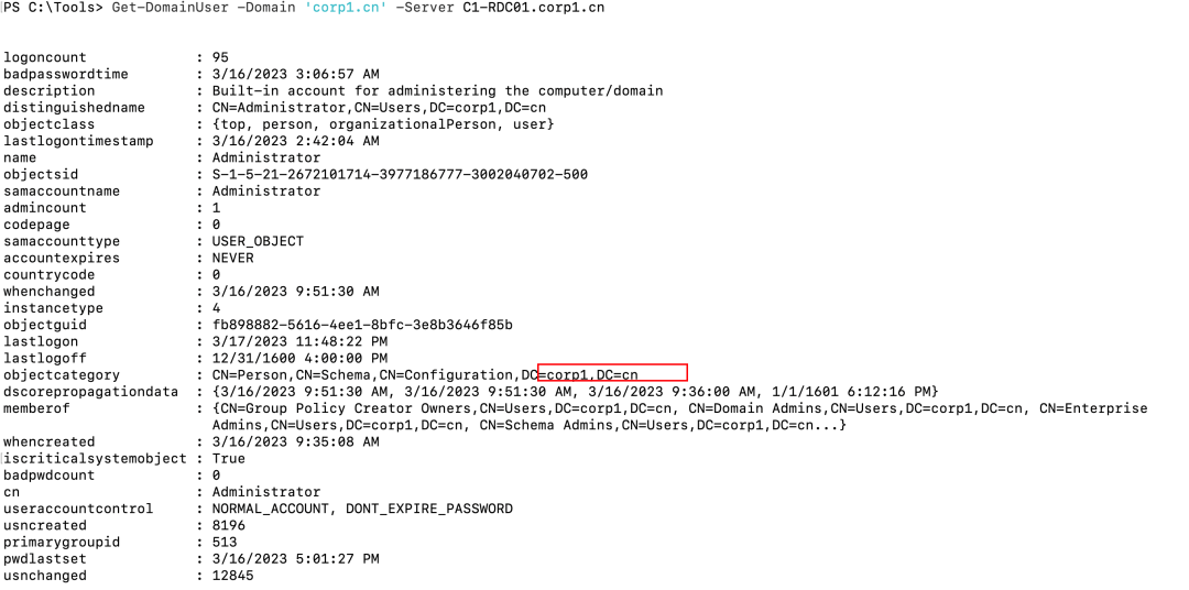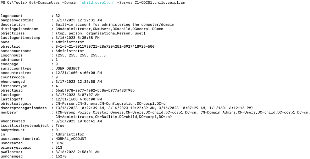 然后PowerView可以查询到child.corp1.cn域内信息: