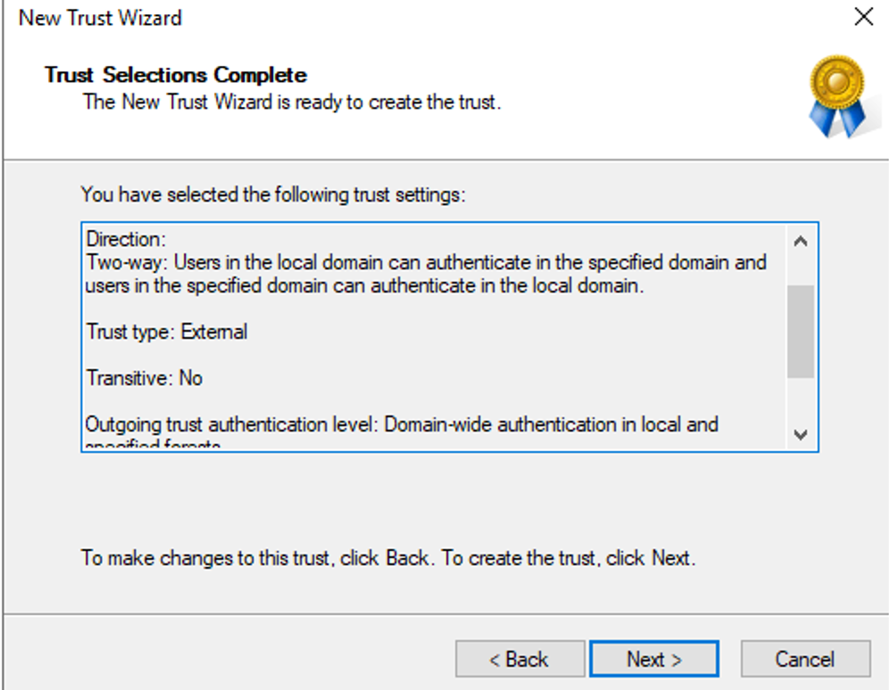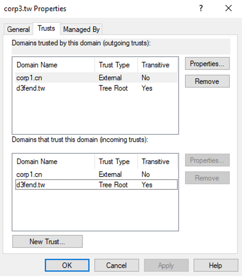 在Windows活动目录环境,存在森林信任(forest trust)和外部信任(external trust)。森林信任是两个森林之间的信任,更准确地说是两个森林根域(root domain)之间的传递性(transitive)信任。即如果我们在森林A和森林B之间建立森林信任,这也将在这两个森林的子域(如果有的话)之间有效。但是对于外部信任,则是非传递性的,即信任只在有信任关系的两个域之间有效。下图为配置外部非传递性信任的信息: