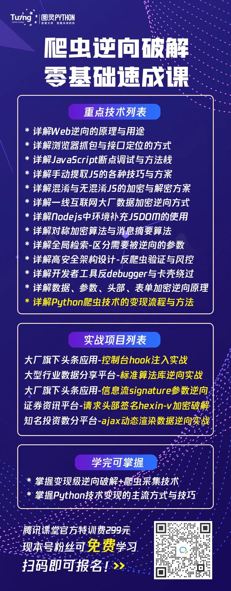 这是一套专讲爬虫与反爬虫攻防的高阶技术实战课,迄今为止已帮助近三万学员快速进阶。本次课程将由国际大数据竞赛获奖大佬亲身指导,带领大家进行一线大厂高阶技术体系+爬虫与反爬虫攻防实战+技术变现路径指导的综合速成训练!