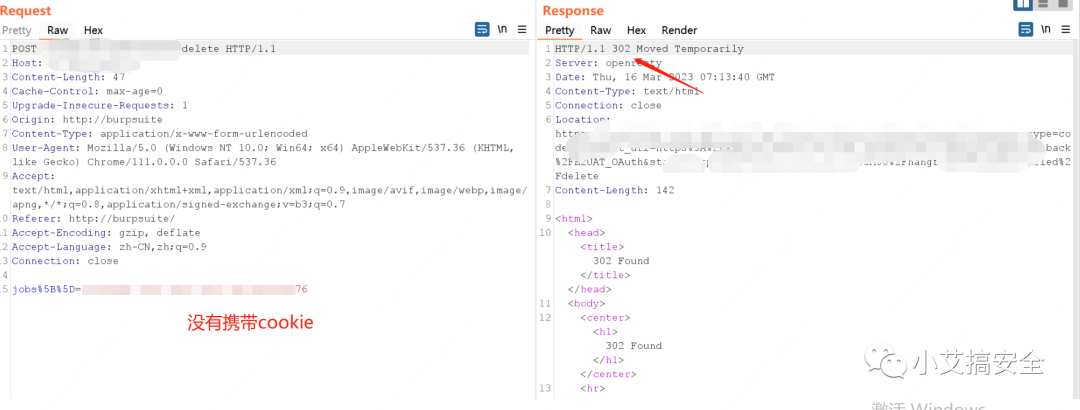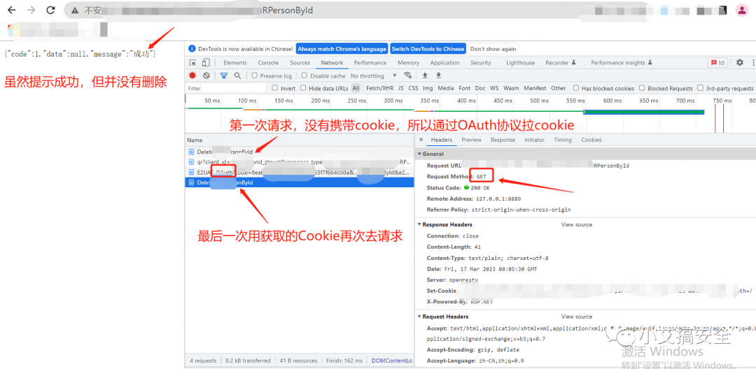 详细说一下上面四个请求的流程,首先第一次请求没有携带Cookie,所以会通过OAuth协议去拉取Cookie,这也是最开始咱们进行复测的时候会出现302跳转的原因。最后一次请求用获取的Cookie在次向接口请求,但是请求方法变成了GET,而删除操作的参数是在POST数据包中,并没有提交过来,所以即使接口返回成功,但是并没有删除。