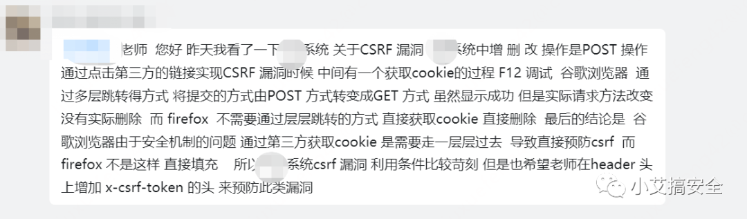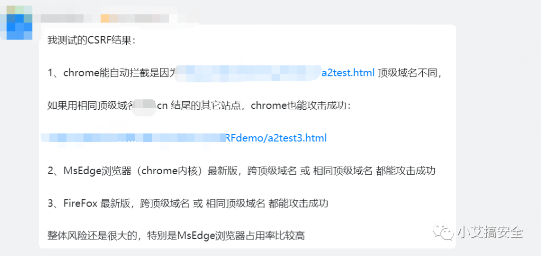 故事背景是对一个项目整体过了一遍后,大部分功能模块是一些越权之类的问题没有发现CSRF,只有对接的一个第三方插件有CSRF的问题,将相关报告提交给了客户。故事的开端是复测的时候,当我用Google浏览器复现CSRF的时候,已经无法复现成功的时候,复测报告对CSRF的漏洞就填写了已修复。然后客户提出了疑问。如下: