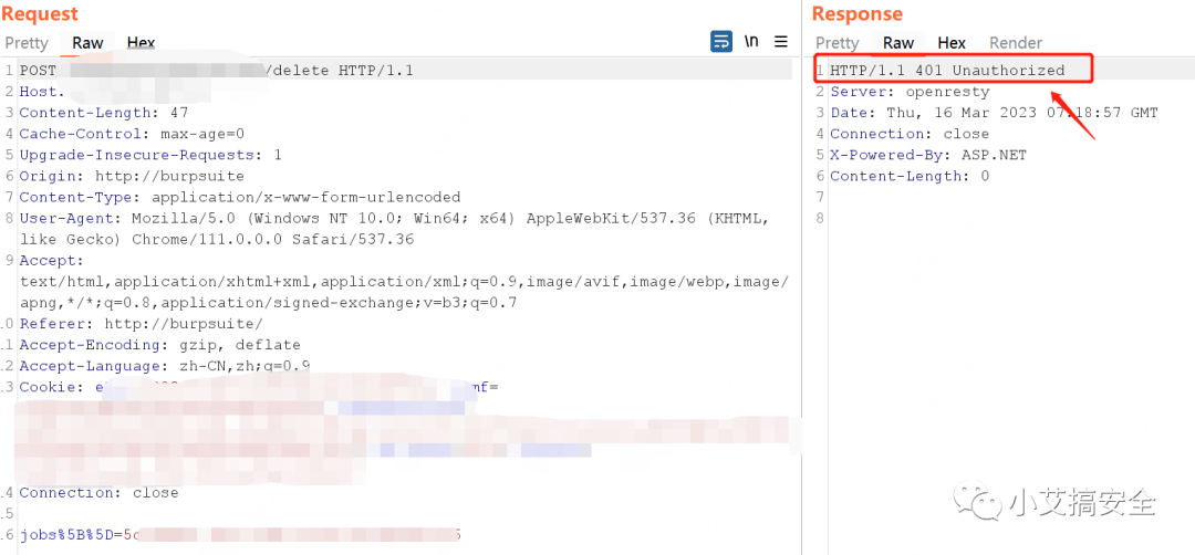 那不行,开始对CSRF进行鞭挞,自己对相关接口进行了反复测试,都已经无法复现,发现携带cookie,但提示401错误,如下:
