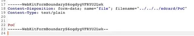 我已经设置了我的 burp 套件代理然后拦截了上传文件请求并修改文件名然后../../../sdcard/PoC转发请求。