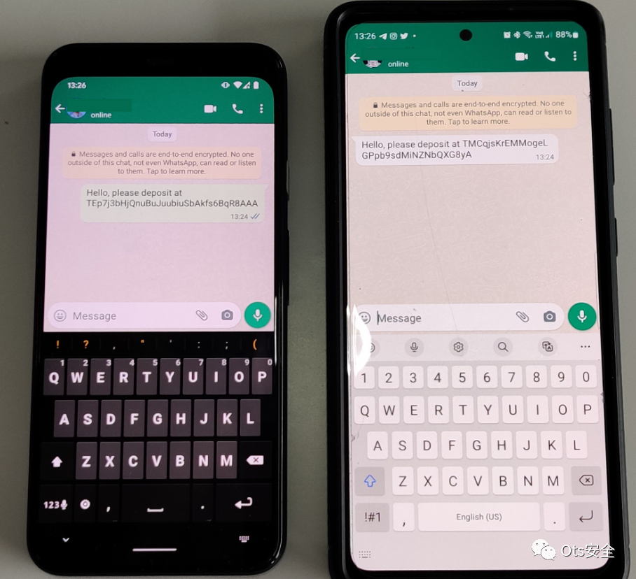 替换钱包地址时,木马化的 Telegram 和 WhatsApp 应用程序的行为方式不同。