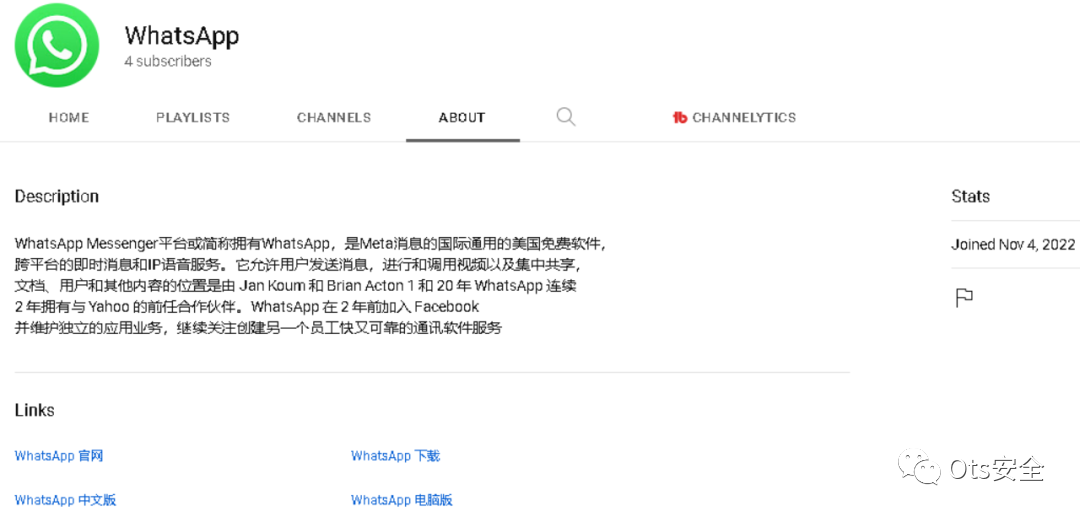 您通常可以在假冒 YouTube 频道的“关于”部分找到指向钓鱼网站的链接。