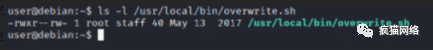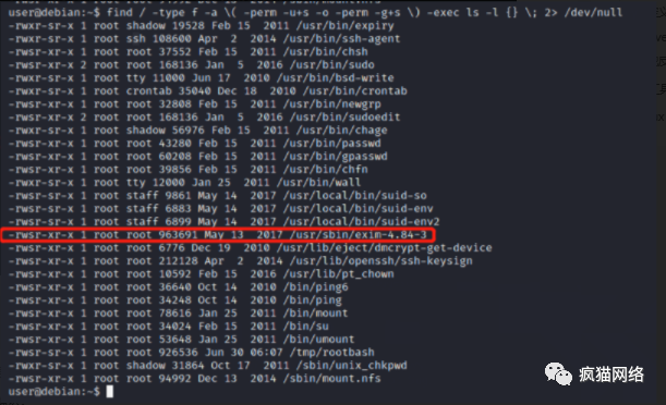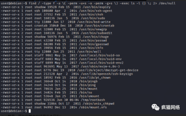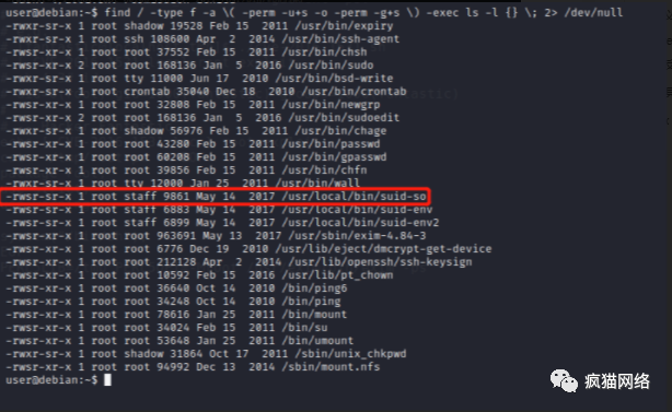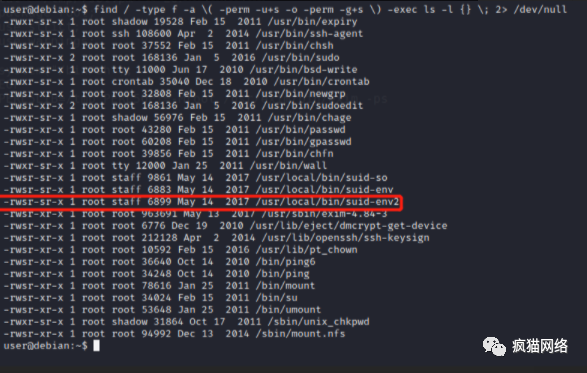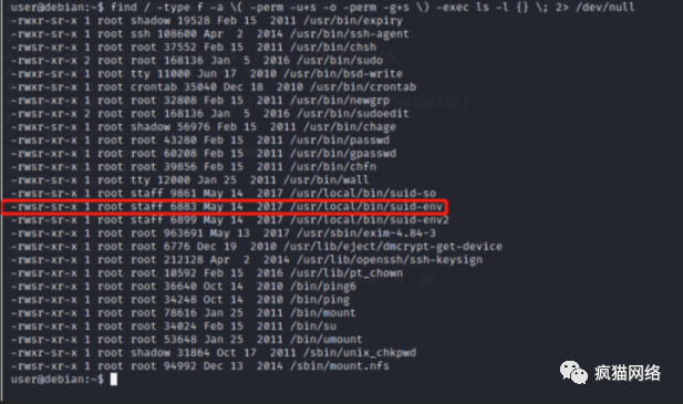 find / -type f -a \( -perm -u+s -o -perm -g+s \) -exec ls -l {} \; 2> /dev/null-rwsr-sr-x 1 root staff 6899 May 14 2017 /usr/local/bin/suid-env2
