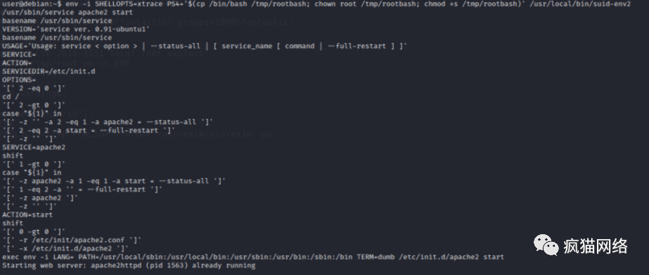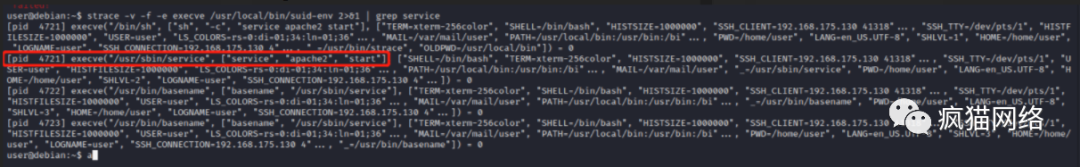 strace -v -f -e execve /usr/local/bin/suid-env 2>&1 | grep service[email protected]:~$ strace -v -f -e execve /usr/local/bin/suid-env 2>&1 | grep service[pid 4721] execve("/bin/sh", ["sh", "-c", "service apache2 start"], ["TERM=xterm-256color", "SHELL=/bin/bash", "HISTSIZE=1000000", "SSH_CLIENT=192.168.175.130 41318"..., "SSH_TTY=/dev/pts/1", "HISTFILESIZE=1000000", "USER=user", "LS_COLORS=rs=0:di=01;34:ln=01;36"..., "MAIL=/var/mail/user", "PATH=/usr/local/bin:/usr/bin:/bi"..., "PWD=/home/user", "LANG=en_US.UTF-8", "SHLVL=1", "HOME=/home/user", "LOGNAME=user", "SSH_CONNECTION=192.168.175.130 4"..., "_=/usr/bin/strace", "OLDPWD=/usr/local/bin"]) = 0[pid 4721] execve("/usr/sbin/service", ["service", "apache2", "start"], ["SHELL=/bin/bash", "TERM=xterm-256color", "HISTSIZE=1000000", "SSH_CLIENT=192.168.175.130 41318"..., "SSH_TTY=/dev/pts/1", "USER=user", "HISTFILESIZE=1000000", "LS_COLORS=rs=0:di=01;34:ln=01;36"..., "PATH=/usr/local/bin:/usr/bin:/bi"..., "MAIL=/var/mail/user", "_=/usr/sbin/service", "PWD=/home/user", "LANG=en_US.UTF-8", "HOME=/home/user", "SHLVL=2", "LOGNAME=user", "SSH_CONNECTION=192.168.175.130 4"...]) = 0[pid 4722] execve("/usr/bin/basename", ["basename", "/usr/sbin/service"], ["TERM=xterm-256color", "SHELL=/bin/bash", "HISTSIZE=1000000", "SSH_CLIENT=192.168.175.130 41318"..., "SSH_TTY=/dev/pts/1", "HISTFILESIZE=1000000", "USER=user", "LS_COLORS=rs=0:di=01;34:ln=01;36"..., "MAIL=/var/mail/user", "PATH=/usr/local/bin:/usr/bin:/bi"..., "_=/usr/bin/basename", "PWD=/home/user", "LANG=en_US.UTF-8", "SHLVL=3", "HOME=/home/user", "LOGNAME=user", "SSH_CONNECTION=192.168.175.130 4"...]) = 0[pid 4723] execve("/usr/bin/basename", ["basename", "/usr/sbin/service"], ["TERM=xterm-256color", "SHELL/bin/bash", "HISTSIZE=1000000", "SSH_CLIENT=192.168.175.130 41318"..., "SSH_TTY=/dev/pts/1", "HISTFILESIZE=1000000", "USER=user", "LS_COLORS=rs=0:di=01;34:ln=01;36"..., "MAIL=/var/mail/user", "PATH=/usr/local/bin:/usr/bin:/bi"..., "PWD=/home/user", "LANG=en_US.UTF-8", "SHLVL=3", "HOME=/home/user", "LOGNAME=user", "SSH_CONNECTION=192.168.175.130 4"..., "_=/usr/bin/basename"]) = [email protected]:~$