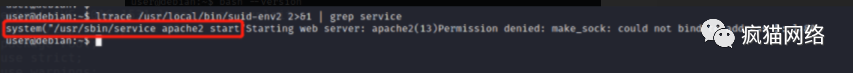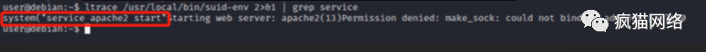 ltrace /usr/local/bin/suid-env 2>&1 | grep service这表明 系统 功能正用于执行 服务 计划。