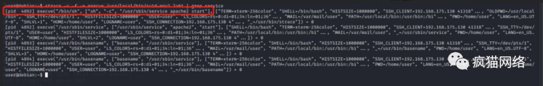 strace -v -f -e execve /usr/local/bin/suid-env2 2>&1 | grep service[email protected]:~$ strace -v -f -e execve /usr/local/bin/suid-env2 2>&1 | grep service[pid 4892] execve("/bin/sh", ["sh", "-c", "/usr/sbin/service apache2 start"], ["TERM=xterm-256color", "SHELL=/bin/bash", "HISTSIZE=1000000", "SSH_CLIENT=192.168.175.130 41318"..., "OLDPWD=/usr/local/bin", "SSH_TTY=/dev/pts/1", "HISTFILESIZE=1000000", "USER=user", "LS_COLORS=rs=0:di=01;34:ln=01;36"..., "MAIL=/var/mail/user", "PATH=/usr/local/bin:/usr/bin:/bi"..., "PWD=/home/user", "LANG=en_US.UTF-8", "SHLVL=1", "HOME=/home/user", "LOGNAME=user", "SSH_CONNECTION=192.168.175.130 4"..., "_=/usr/bin/strace"]) = 0[pid 4892] execve("/usr/sbin/service", ["/usr/sbin/service", "apache2", "start"], ["SHELL=/bin/bash", "TERM=xterm-256color", "HISTSIZE=1000000", "SSH_CLIENT=192.168.175.130 41318"..., "SSH_TTY=/dev/pts/1", "USER=user", "HISTFILESIZE=1000000", "LS_COLORS=rs=0:di=01;34:ln=01;36"..., "PATH=/usr/local/bin:/usr/bin:/bi"..., "MAIL=/var/mail/user", "_=/usr/sbin/service", "PWD=/home/user", "LANG=en_US.UTF-8", "HOME=/home/user", "SHLVL=2", "LOGNAME=user", "SSH_CONNECTION=192.168.175.130 4"...]) = 0[pid 4893] execve("/usr/bin/basename", ["basename", "/usr/sbin/service"], ["TERM=xterm-256color", "SHELL=/bin/bash", "HISTSIZE=1000000", "SSH_CLIENT=192.168.175.130 41318"..., "SSH_TTY=/dev/pts/1", "HISTFILESIZE=1000000", "USER=user", "LS_COLORS=rs=0:di=01;34:ln=01;36"..., "MAIL=/var/mail/user", "PATH=/usr/local/bin:/usr/bin:/bi"..., "_=/usr/bin/basename", "PWD=/home/user", "LANG=en_US.UTF-8", "SHLVL=3", "HOME=/home/user", "LOGNAME=user", "SSH_CONNECTION=192.168.175.130 4"...]) = 0[pid 4894] execve("/usr/bin/basename", ["basename", "/usr/sbin/service"], ["TERM=xterm-256color", "SHELL=/bin/bash", "HISTSIZE=1000000", "SSH_CLIaENT=192.168.175.130 41318"..., "SSH_TTY=/dev/pts/1", "HISTFILESIZE=1000000", "USER=user", "LS_COLORS=rs=0:di=01;34:ln=01;36"..., "MAIL=/var/mail/user", "PATH=/usr/local/bin:/usr/bin:/bi"..., "PWD=/home/user", "LANG=en_US.UTF-8", "SHLVL=3", "HOME=/home/user", "LOGNAME=user", "SSH_CONNECTION=192.168.175.130 4"..., "_=/usr/bin/basename"]) = 0a