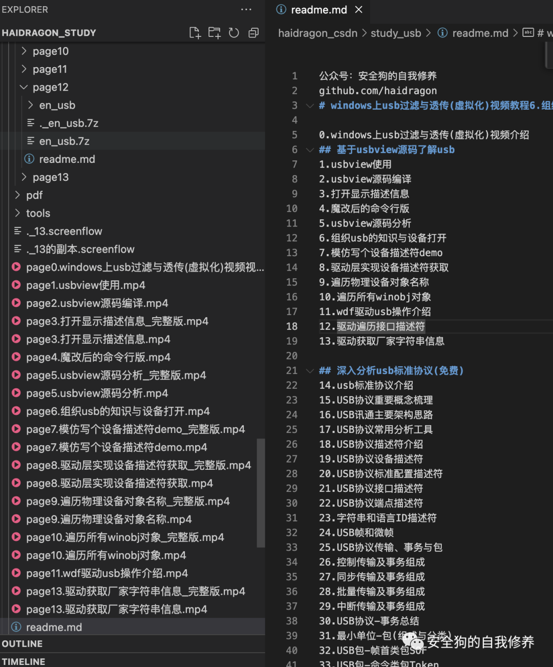公众号:安全狗的自我修养github.com/haidragon# windows上usb过滤与透传(虚拟化)视频教程0.windows上usb过滤与透传(虚拟化)视频介绍## 基于usbview源码了解usb1.usbview使用2.usbview源码编译3.打开显示描述信息4.魔改后的命令行版5.usbview源码分析6.组织usb的知识与设备打开7.模仿写个设备描述符demo8.驱动层实现设备描述符获取9.遍历物理设备对象名称10.遍历所有winobj对象11.wdf驱动usb操作介绍12.驱动遍历接口描述符13.驱动获取厂家字符串信息## 深入分析usb标准协议(免费)14.usb标准协议介绍15.USB协议重要概念梳理16.USB讯通主要架构思路17.USB协议常用分析工具18.USB协议描述符介绍19.USB协议设备描述符20.USB协议标准配置描述符21.USB协议接口描述符22.USB协议端点描述符23.字符串和语言ID描述符24.USB帧和微帧25.USB协议传输、事务与包26.控制传输及事务组成27.同步传输及事务组成28.批量传输及事务组成29.中断传输及事务组成30.USB协议-事务总结31.最小单位-包(组成与分类)32.USB包-帧首类包SOF33.USB包-命令类包Token34.USB包-数据类包DATA35.USB包-握手类包Handshake36.USB包-控制传输包结构37.USB包-同步传输包结构38.USB包-批量传输包结构39.USB包-中断传输包结构40.usb的枚举(基于windows)## USBPcap源码分析41.USBPcap源码编译与调试42.usb过滤驱动实现方式介绍43.AddDevice函数分析44.USBPcap入口函数分析45.DkCreateClose函数分析46.DkReadWrite函数分析47.DkDevCtl函数分析48.DkInDevCtl函数分析49.png例和函数分析50.其它函数分析51.核心部分-协议分析与包生成52.USBPcap过滤驱动总结# 键盘鼠标过滤器53.键盘过滤器原理分析55.键盘过滤器代码讲解53.鼠标过滤器原理分析55.鼠标过滤器代码讲解## usbdk源码分析56.usbdk源码编译与调试57.usbdk与libusb操作介绍58.libusb接口源码分析59.usbdk所有类整理60.usbdk入口函数分析61.adddevice函数分析62.usbdk安装成过滤器分析63.libusb打开函数分析(usbdk部分)64.分析usbdk的ioctls65.usbdk本地隐藏的思路66.usbdk的重定向思路总结## 实现一个自己的usb过滤驱动* 1.注册过滤驱动* 2.附加设备栈时机* 3.创建控制设备* 4.保存设备信息* 5.实现IO例程## 透传* 6.实现usb操作* 7.实现本地隐藏* 8.实现网络透传## 虚拟总线* 9.虚拟总线介绍* 10.