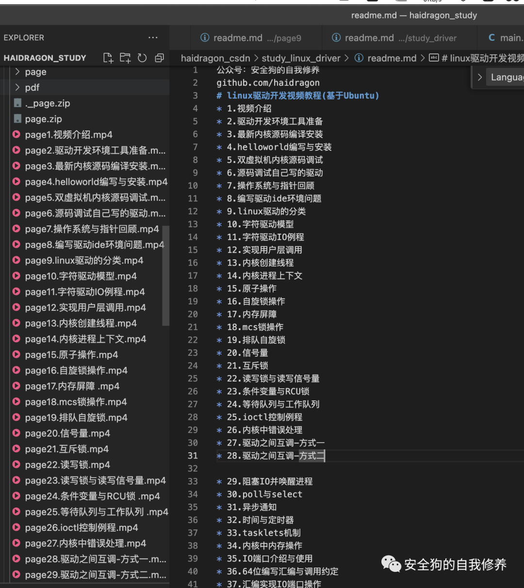 公众号:安全狗的自我修养github.com/haidragon# linux驱动开发视频教程(基于Ubuntu)* 1.视频介绍* 2.驱动开发环境工具准备* 3.最新内核源码编译安装* 4.helloworld编写与安装* 5.双虚拟机内核源码调试* 6.源码调试自己写的驱动* 7.操作系统与指针回顾* 8.编写驱动ide环境问题* 9.linux驱动的分类* 10.字符驱动模型* 11.字符驱动IO例程* 12.实现用户层调用* 13.内核创建线程* 14.内核进程上下文* 15.原子操作* 16.自旋锁操作* 17.内存屏障* 18.mcs锁操作* 19.排队自旋锁* 20.信号量* 21.互斥锁* 22.读写锁与读写信号量* 23.条件变量与RCU锁* 24.等待队列与工作队列* 25.ioctl控制例程* 26.内核中错误处理* 27.驱动之间互调-方式一* 28.驱动之间互调-方式二* 29.阻塞IO并唤醒进程* 30.poll与select* 31.异步通知* 32.时间与定时器* 33.tasklets机制* 34.内核中内存操作* 35.IO端口介绍与使用* 36.64位编写汇编与调用约定* 37.汇编实现IO端口操作* 38.pci总线介绍与获取* 39.usb设备基础* 40.linux设备模型* 41.热插拔事件* 42.内核内存映射* 43.块驱动注册* 44.网络驱动ksocket开发