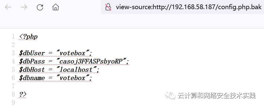浏览器访问http://192.168.58.187/config.php.bak,查看页面源码,