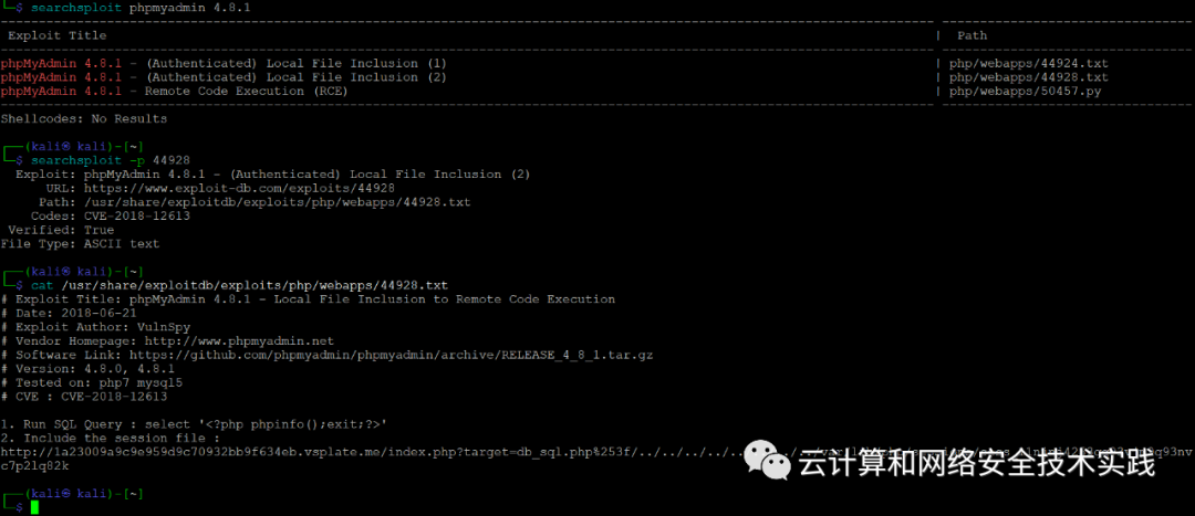 确认到应用信息phpmyadmin 4.8.1,搜索可利用的漏洞,