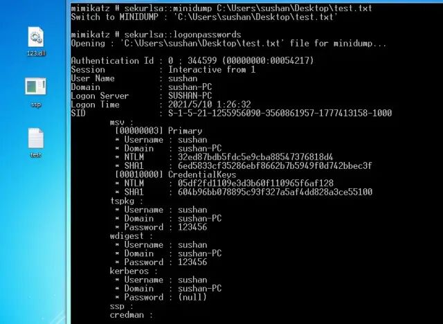 case DLL_THREAD_ATTACH:管理员权限运行SSP.exe,卡巴全程没拦截直接输出test文件,再使用mimikatz加载解析test文件,成功获取测试环境下账号的明文密码以及哈希值: