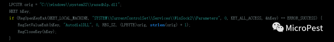 RegSetValueExA(hKey, "AutodialDLL", 0, REG_SZ, (LPBYTE)orig, strlen(orig) + 1);