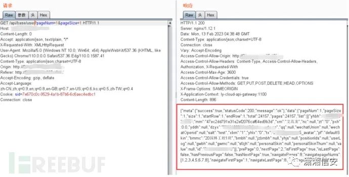 然后我修改pageNum和pageSize这两个参数的大小,结果测试后pageNum=1,2,3,4,5和pageSize=1000的时候,分别泄露不同的一千个人的信息,pageNum后面的数字超过5之后,就没有信息了(这个学校的学生可能就这么多了)。并且pageSize后面的数值太大会造成超时。