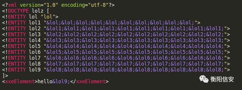 从上图中,我们看到当解析器开始解析XML文件时,最初是“&lol9;” 引用实体“lol9”来获取值,但“lol9”本身再次引用“lol8”实体。