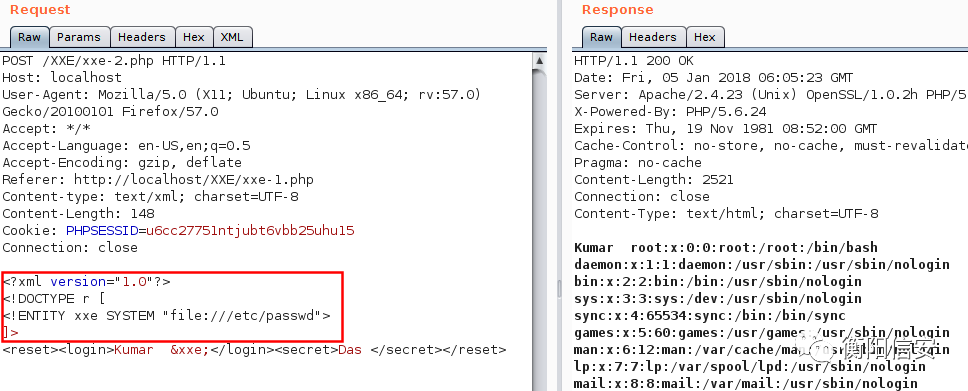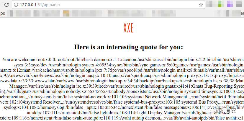 在少数情况下,在使用精心设计的XXE payload提交HTTP请求时,服务器使用服务器的/etc/passwd/进行响应。